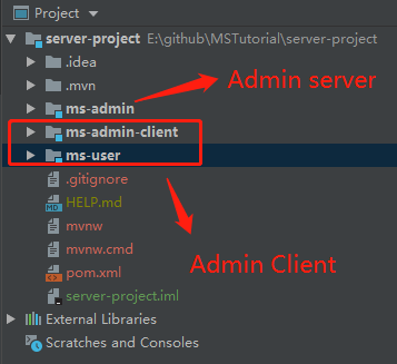 为了学习和验证 Spring Boot Admin 的使用,我创建了一个 Admin-Server 工程即 ms-admin ,创建了两个 Admin-Client 工程即 ms-user 和 ms-admin-client ,工程结构如下图:
