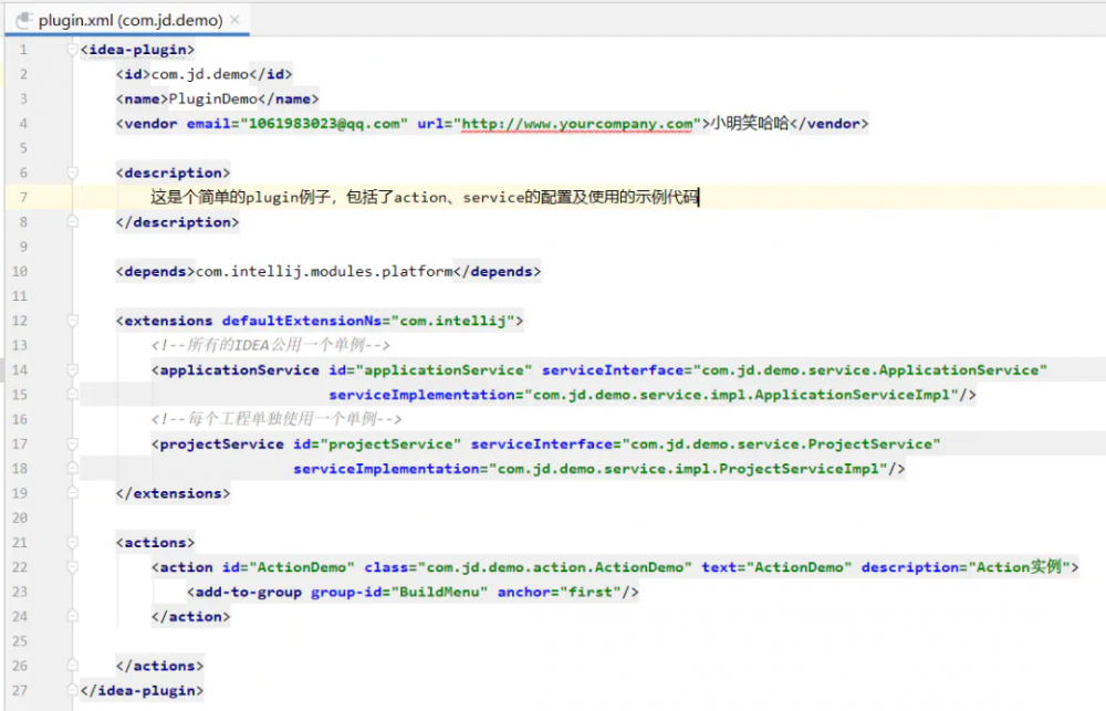 (1) Actions :这货就跟controller类似,简单一点来说,当用户点击idea的某个按钮你自己开发的菜单时就会调用的方法。所有的action都需要继承 com.intellij.openapi.actionSystem.AnAction 这个抽象类,实现actionPerformed方法即可,至于按钮在什么位置,则是有add-group相关参数进行配置,这个后边得连载中详细解释。