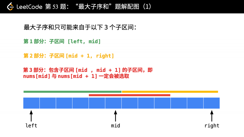 [left, mid] ; [mid + 1, right] ; [mid , mid + 1] 的子区间,即 nums[mid] 与 nums[mid + 1] 一定会被选取。 对它们三者求最大值即可。