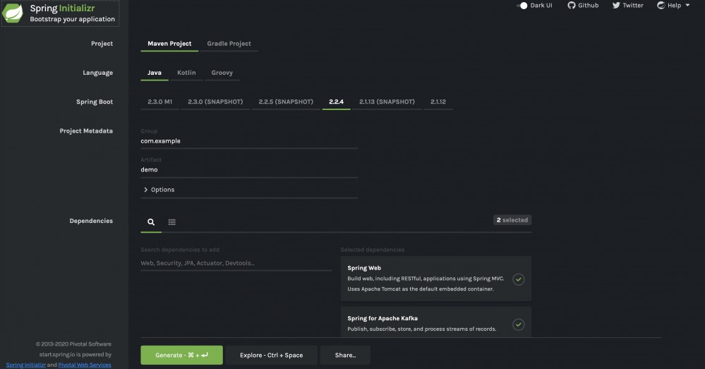 当我们到了这一步之后,你就可以试着运行项目了,运行成功后你会发现 Spring Boot 会为你创建两个 topic: