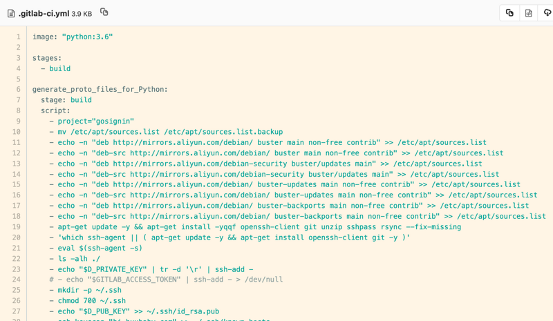 gitlab 的 CI runner 可以自行查找官方文档配置。配置完成之后在 proto 文件仓库中添加 `.gitlab-ci.yaml` 文件,大概内容如下: