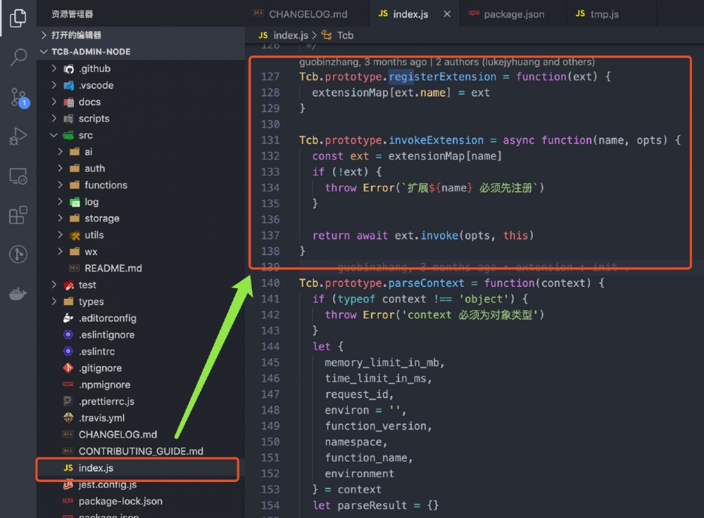 打开项目根目录下的 index.js 文件,可以看到挂在 Tcb 原型链上的 registerExtension 和 invokeExtension 方法,如下图所示: