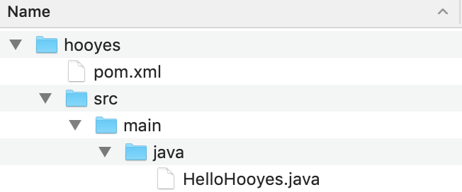 我们注意到,里面有两个核心文件,一个是 pom.xml ,另一个是 HelloHooyes.java ,值到注意的是目录的结构是严格的,pom.xml 必须在根目录下,HelloHooyes.java 必须在 src/main/java/ 目录下。