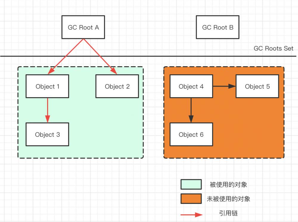 可达性算法的基本思想就是通过一系列被称为"GC Roots"的对象作为起始点,由这些节点开始向下搜索,搜索所走过的路径称为引用链(Reference Chain),当一个GC Roots对象没有任何引用链相连时,则证明该对象是不可用的。