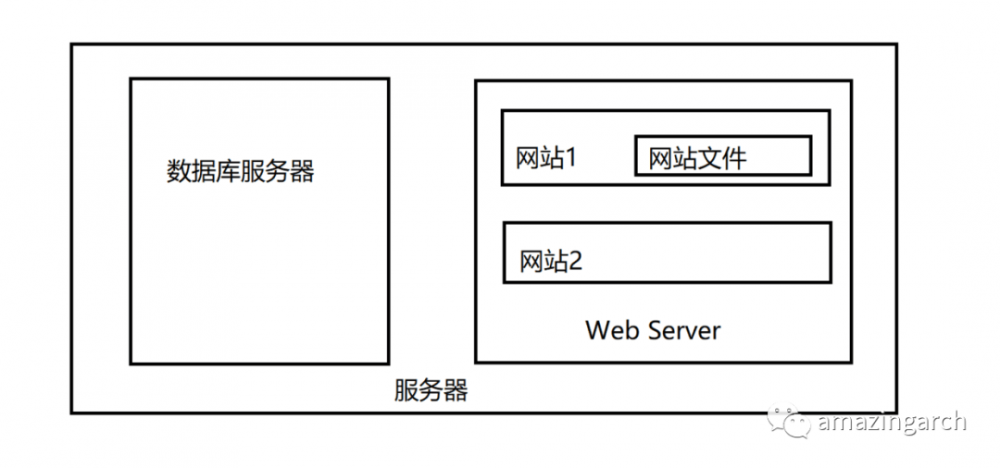 最早的我们的网站只有一台服务器,网站应用 + 数据库 + 网站文件 都在同一台服务器上,有的时候一台服务器上也会有多个网站。