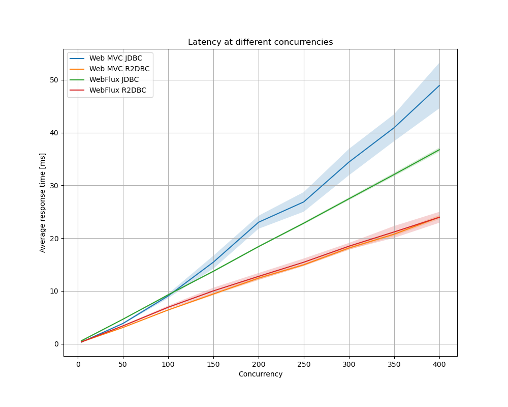 很显然在高并发下,Spring Web MVC + JDBC可能不是你的最佳选择。显然在更高的并发下,R2DBC可以提供更好的响应时间。Spring Web MVC和Spring WebFlux也有类似的趋势。