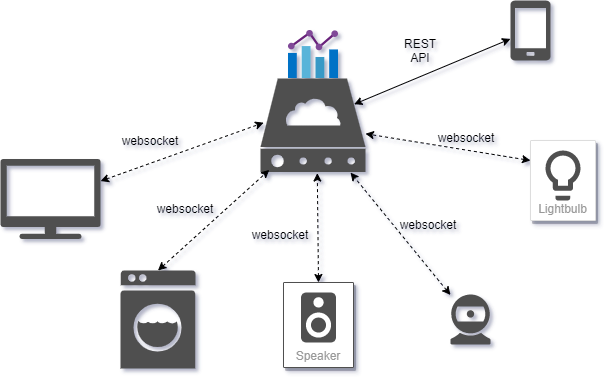在我们的方案中,所有智能设备都具有与服务器的持久连接。服务器负责将命令发送到特定设备,例如打开客厅灯或启用警报。它还可以从设备接收信息。例如,可能有一个温度传感器每分钟读取一次读数,或者有一个烤箱在温度过高时发出警报。最后,服务器还可以向所有设备发出命令,例如打开/关闭。该服务器还公开了REST API,供用户用来收集信息和控制设备。
