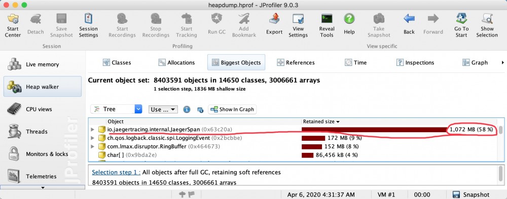 发现大对象,这里是因为我们用了Jeager链路跟踪,但是用过多线程导致ThreadLocal没有释放掉。