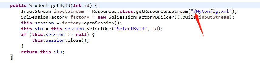 ③写法为:org.apache.ibatis.io.Resources.getResourceAsStream(),部分编程环境可能直接是Resources.getResourceAsStream(),例如myecplise编程环境就不需要前面的调用路径org.apache.ibatis.io(我是用的是ecplise编程环境,不知道为什么一定需要加上调用路径,不加还报错 = =!)