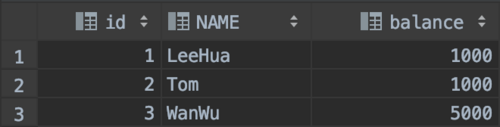 INSERT INTO account (NAME, balance) VALUES ('LeeHua', 1000), ('Tom', 1000), ('WanWu', 2000);