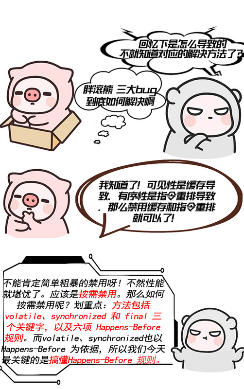 比如某天老板问你“胖滚猪,我这段并发代码会有线程安全问题吗”,那么你可以对照着happens-before原则一个个看,要是符合其中之一并且是原子性的,你就可以大声告诉老板“没得问题!”