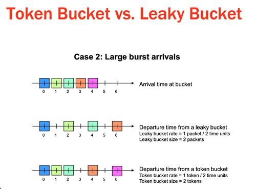 https://en.wikipedia.org/wiki/Leaky_bucketThe leaky bucket as a meter is exactly equivalent to (a mirror image of) the token bucket algorithm , i.e. the process of adding water to the leaky bucket exactly mirrors that of removing tokens from the token bucket when a conforming packet arrives, the process of leaking of water from the leaky bucket exactly mirrors that of regularly adding tokens to the token bucket, and the test that the leaky bucket will not overflow is a mirror of the test that the token bucket contains enough tokens and will not ‘underflow’. Thus, given equivalent parameters, the two algorithms will see the same traffic as conforming or nonconforming. The leaky bucket as a queue can be seen as a special case of the leaky bucket as a meter.