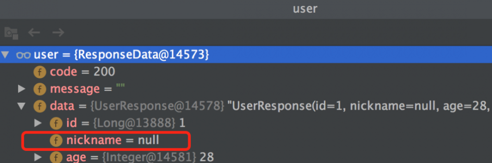 但是某一个字段的值不见了,这种情况还真没遇到过。下图就是调用方的获取的信息,nickname 值丢了。