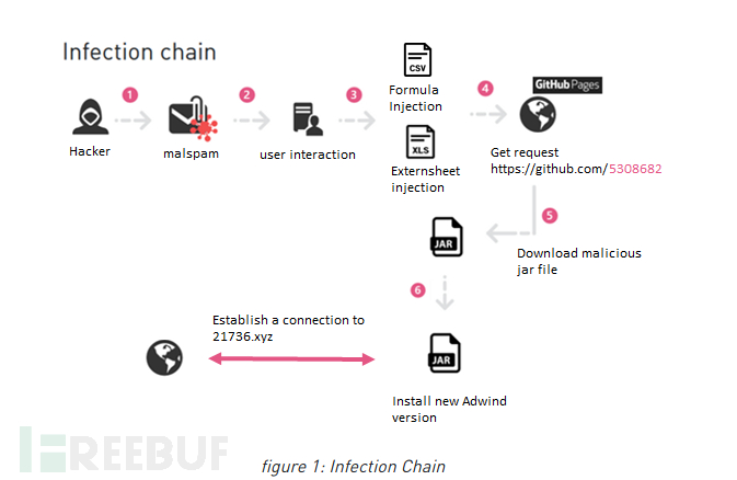 初始攻击媒介是含有Office文件的钓鱼邮件,该文件采用BIFF格式,普通的Office工具无法解析该文件。 运行后下载恶意Jar文件,该文件被高度混淆,使用了多种规避技术,避免自身被安全产品检测。Jar文件会在目标中植入多平台恶意软件Adwind RAT,窃取目标敏感信息,并将结果发送到攻击者的C&C服务器上,同时攻击者可获得对目标计算机的访问权。