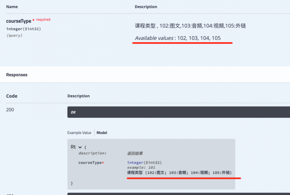 请注意哦,这里是课程类型不是我们手动列举出来的,是swagger框架帮我们自动列举的。对应的代码如下: