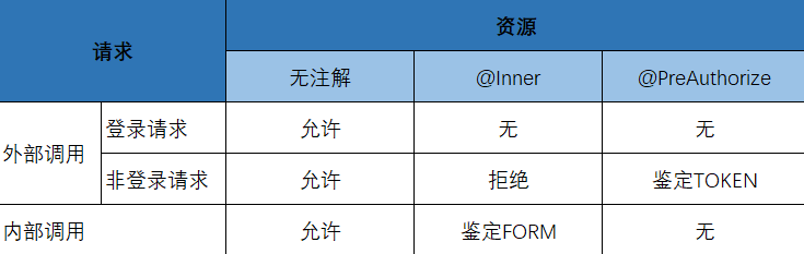 对于请求而言,主要是 外部 与 内部 的区别,而外部请求必须经过网关(Gateway),网关对于请求的处理主要有 登录 与 非登录 的区别,因此上面表格中将外部请求细分为登录与非登录,这样对比资源的控制就更清晰、更细化