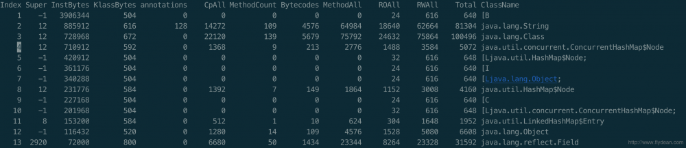 num是对象的编号,instances是对象的个数,bytes是对象的大小,class name是对象的class名字。