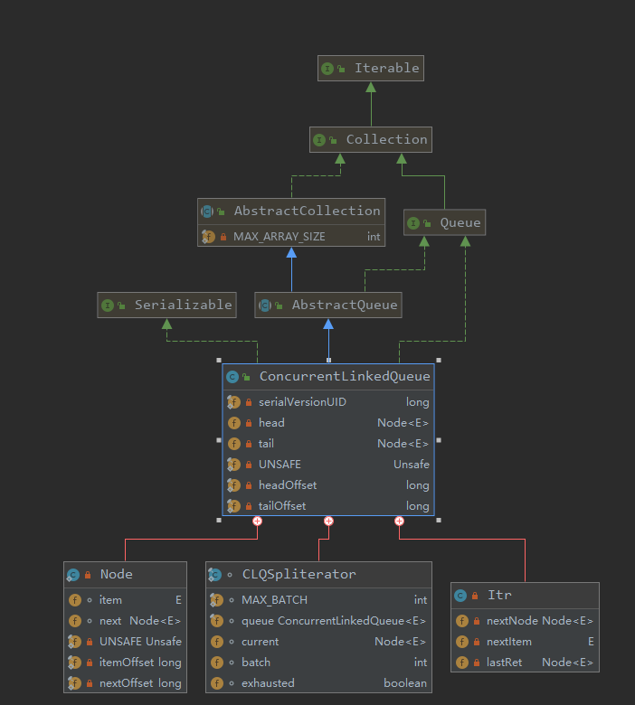 通过 ConcurrentLinkedQueue 的类图来分析一下它的结构: