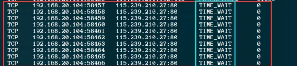 虽然项目已经运行结束,但是连接依然存在,状态为" TIME_WAIT"(继续等待看是否还有延迟的包会传输过来;默认在windows下, TIME_WAIT 状态将会使系统将会保持该连接 240s。