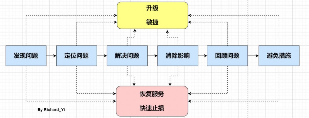 只不过这里先提示一下。在线上应急过程中要记住,只有一个总体目标: 「 尽快恢复服务,消除影响 」 。 不管处于应急的哪个阶段,我们首先必须想到的是恢复问题,恢复问题不一定能够定位问题,也不一定有完美的解决方案,也许是通过经验判断,也许是预设开关等,但都可能让我们达到快速恢复的目的,然后保留部分现场,再去定位问题、解决问题和复盘。