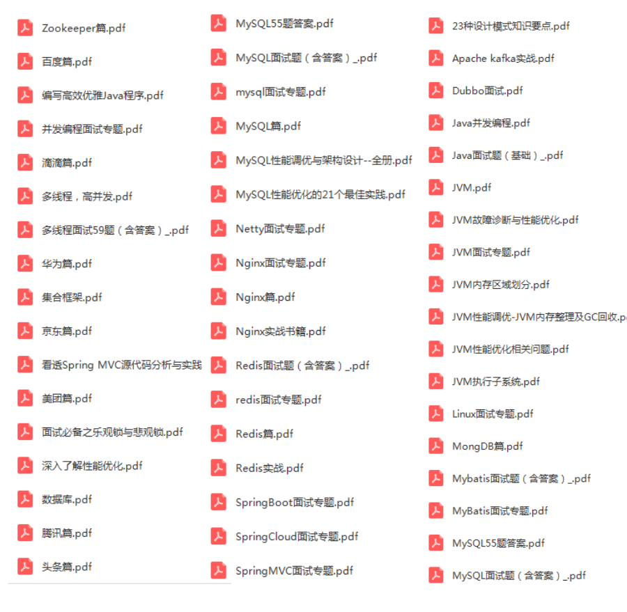 这套合集中面试题集包含了以下十几个模块:Java 基础、容器、多线程、反射、对象拷贝、Java Web 模块、异常、网络、设计模式、Spring/Spring MVC、Spring Boot/Spring Cloud、Hibernate、Mybatis、RabbitMQ、Kafka、Zookeeper、MySql、Redis、JVM,供大家查漏补缺。