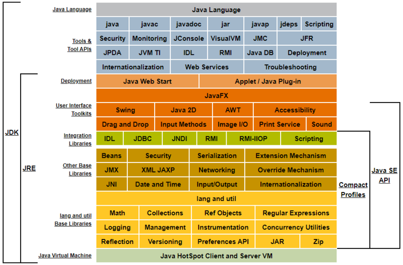 JDK 包含 JRE 和 JVM , JRE 包含 JVM javac 用于编译java代码到字节码文件 java 命令启动 JVM ,字节码最终运行在 JVM 上 JavaFX 是一种富客户端技术,用于替换flash和Swing程序 Java Web Start 第一次运行需要借助浏览器,之后生成快捷方式当web站点更新是程序也更新,效果类似Swing