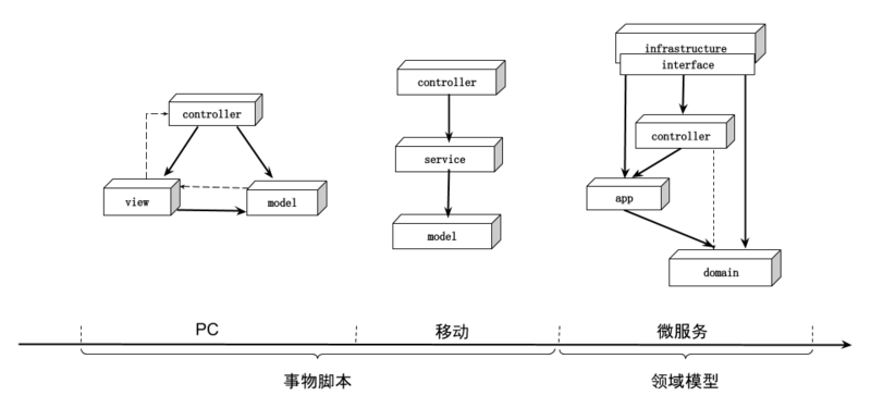 自从把数据,模型,行为3兄弟从大杂烩解放出来后,他们就一直缠着你,这种纠缠很有可能伴随你的整个职业生涯。在PC时代,我们把3兄弟放到model里,所以当时有 胖M,廋C 的说法,有了经验后,在移动时代,我们把行为抽出来放到 service ,model留下数据和模型,再到现在的微服务时代,我们把行为和模型放到 domain ,数据放到了 infrastructure 。整个演进过程都围绕着这3兄弟。