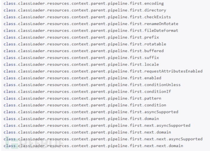 Object是java的基础类,所有的class生成的对象,都会继承Object的所有属性和方法,因此当前action无论是什么代码,必须有Object自带的getClass方法,这个方法会返回一个Class对象,Class对象又一定会有getClassLoader方法,最终在每个action都可以操控class。Struts2-020允许访问直接映射到“getClass()”方法的“class”参数 ,这可以被利用来操纵所使用的应用程序服务器的ClassLoader。简而言之就是可以通过ClassLoader操控Tomcat的一些配置属性,这个漏洞在Tomcat8下是可以getshell的。如下图为tomcat8部分可控属性。