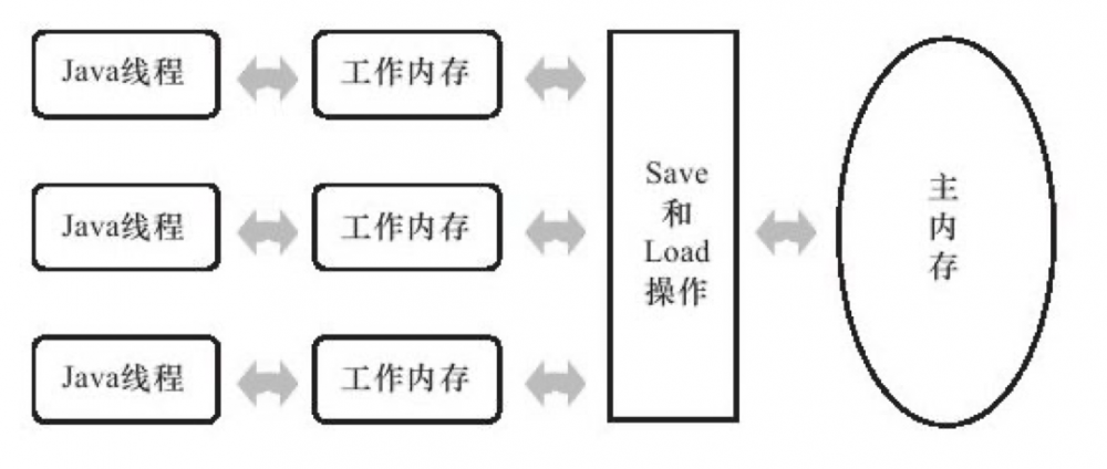 在著名的 《深入理解 Java 虚拟机》一书的图 12-1 指出了在 JMM 内,线程、主内存、工作内存的关系。图片来自该书的 Kindle 版: