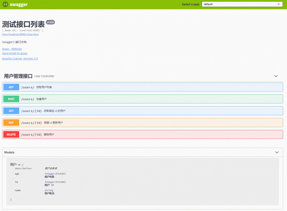 启动项目,访问 http://localhost:8080/swagger-ui.html ,可以看到我们定义的文档已经在 Swagger 页面上显示了,如下图所示:
