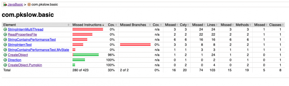 执行 mvn clean verify ,就会生成报告 target/site/jacoco/ ,有多种格式,用浏览器打开 index.html 文件可以方便查看。如下图所示: