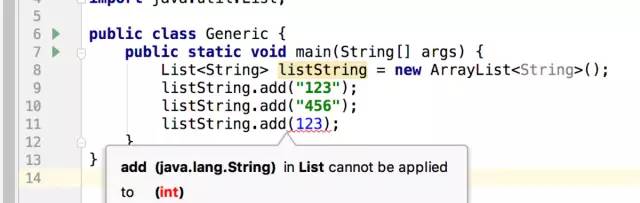 这里可以看出来在代码编写阶段就已经报错了,不能往string类型的集合中添加int类型的数据。