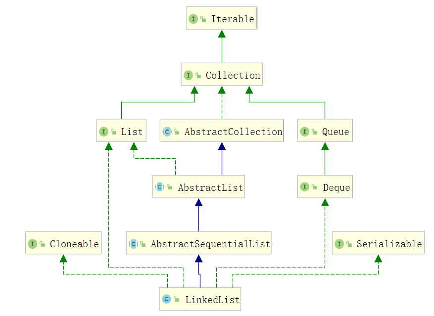 此图由IDEA生成,由图可得出其继承关系分别是继承自AbstractSequentialList,实现了Cloneable、List、Deque、Serializable接口。