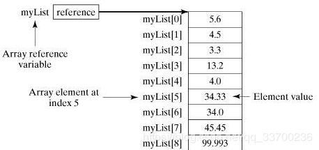 下面的图片描绘了数组 myList。这里 myList 数组里有 10 个 double 元素,它的下标从 0 到 9。