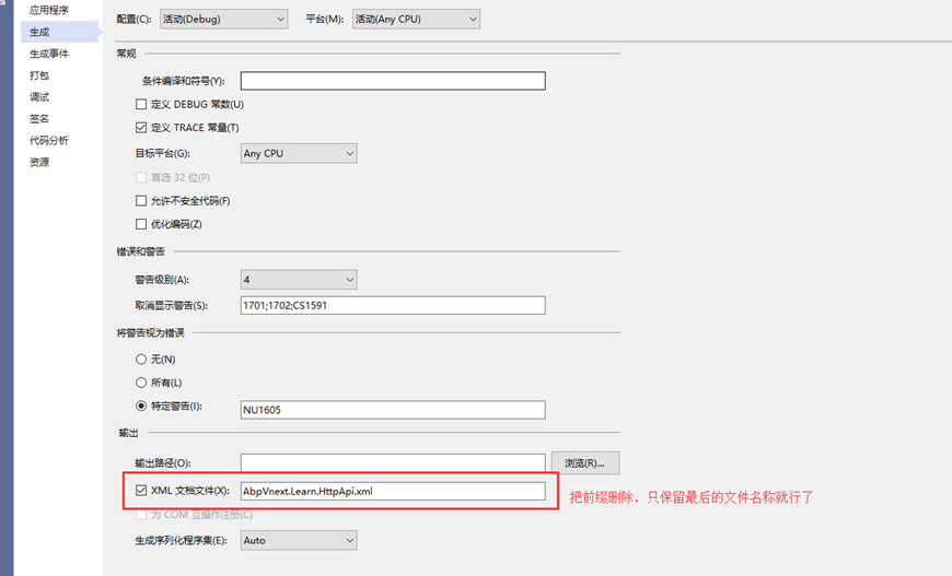 1、选中AbpVnext.Learn.HttpApi项目-》右键-》属性-》生成;然后如下配置输出xml文档