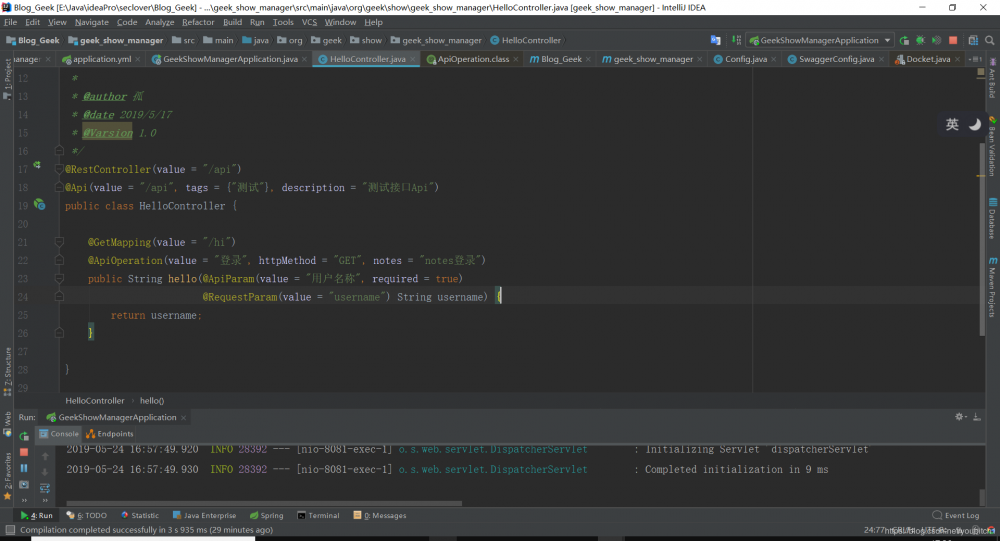 其次springfox为我们提供了一个Docket(摘要的意思)类,我们需要把它做成一个Bean注入到spring中,显然,我们需要一个配置文件,并通过一种方式(显然它会是一个注解)告诉程序.这是一个Swagger配置文件。