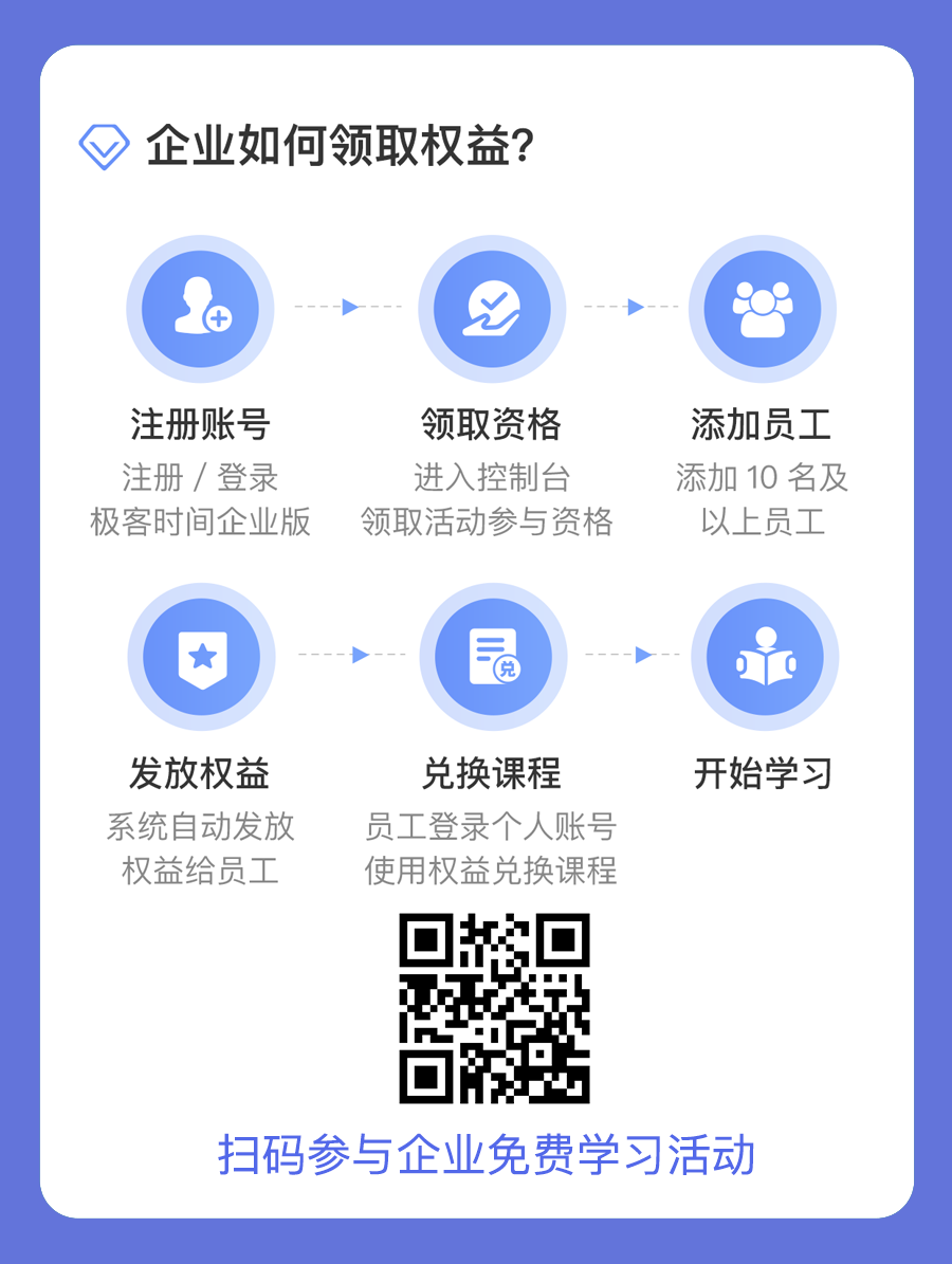 「 极客时间企业版」 最近推出了一个活动,面向企业免费开放全部课程。 企业里的每个技术人,都可以在极客时间上 任意选择三门课程(专栏、视频、微课),免费学习一个月的时间 。