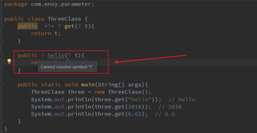这个是不是和前面的非常相似,一不留神你还以为两者是一样的呢。请注意后者 public 与 T 之间没有使用 <T> ,也就是说明这个方法并不是泛型方法,而且你会发现编译器还抛异常: