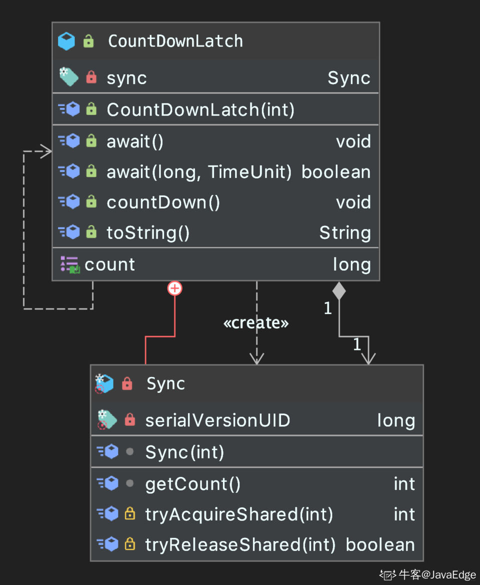 和 ReentrantLock 一样,CountDownLatch类也存在一个内部同步器 Sync,继承了 AbstractQueuedSynchronizer