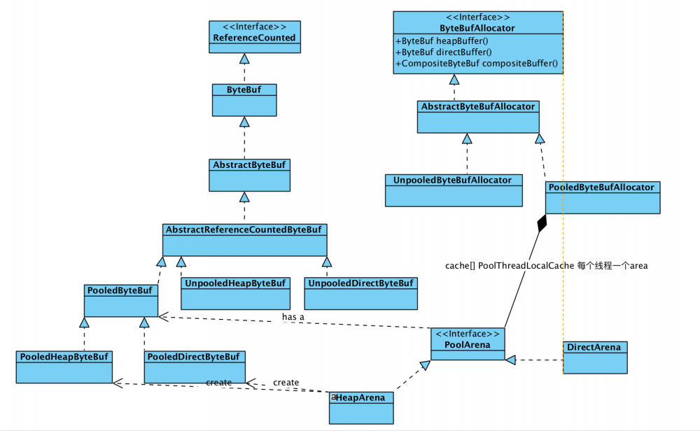 其中PooledByteBufAllocator 里面含有一个PoolArena ,他是每一个线程都有自己独立的PoolArena ,这样的设计也降低了线程资源的并发需要一些同步带来的复杂设计,已经性能降低