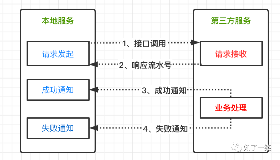基于接口异步响应的方式,有一个本地业务服务,第三方接口服务,流程如下: