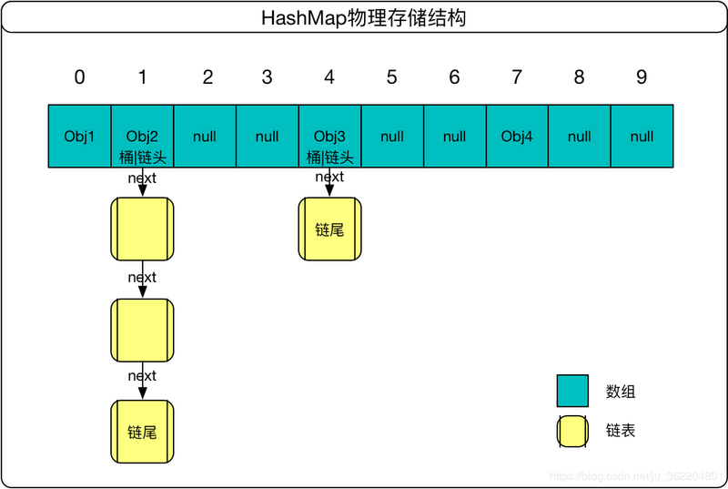 如上图所示,HashMap底层是用数组+链表+红黑树实现的,其中红黑树是JDK1.8对HashMap优化之后加入的,当链表的长度大于8的时候会由链表结构转为红黑树,这些等下在看源码分析的时候都可以看到具体的实现。