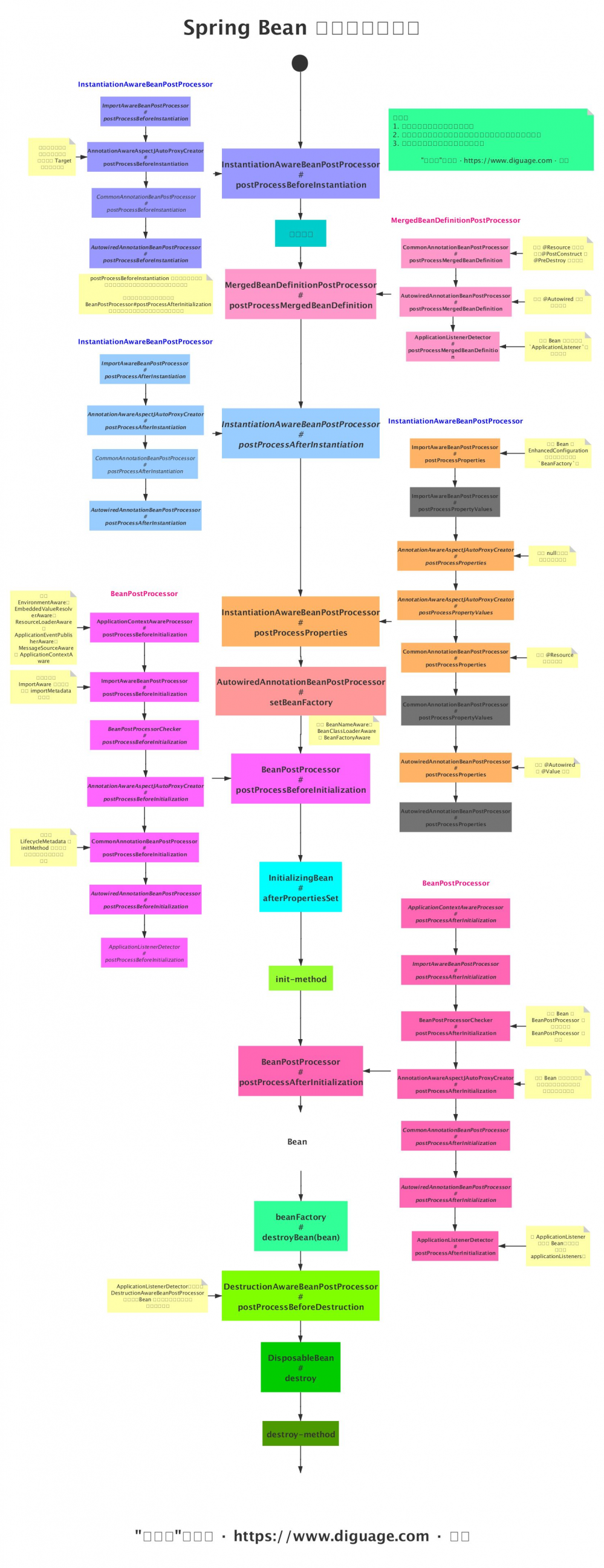 直接上图:Spring Bean 生命周期流程图。内容较多,图片文字偏小,请放大看(矢量图,可以任意放大):
