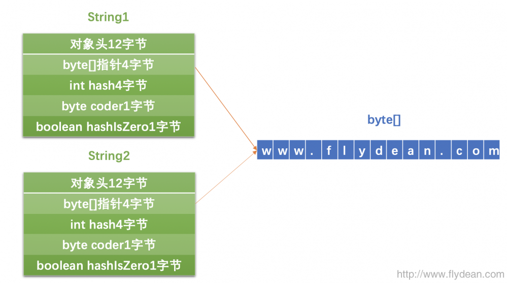 上图中的String1和String2指向的是同一个byte[]数组。