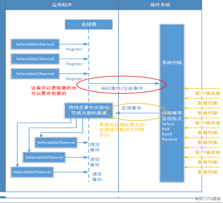Java NIO的选择器允许一个单独的线程来监视多个输入通道,你可以注册多个通道使用一个选择器,然后使用一个单独的线程来“选择”通道:这些通道里已经有可以处理的输入,或者选择已准备写入的通道。这种选择机制,使得一个单独的线程很容易来管理多个通道。
