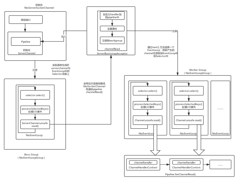 这边是利用一个ServerBootstrapAcceptor来监听channelRead事件,将新产生的channel绑定到childGroup (workerGroup),最终是绑定到WorkerGroup中某个EventLoop 中去。