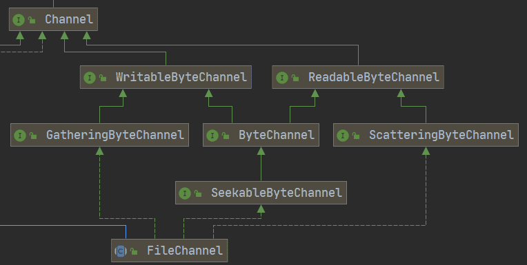 在nio中,所有channel继承自*Channel(java.nio.channels.Channel)*接口,它代表一个可以进行io操作的连接,可以是硬件设备,文件,网络等等.