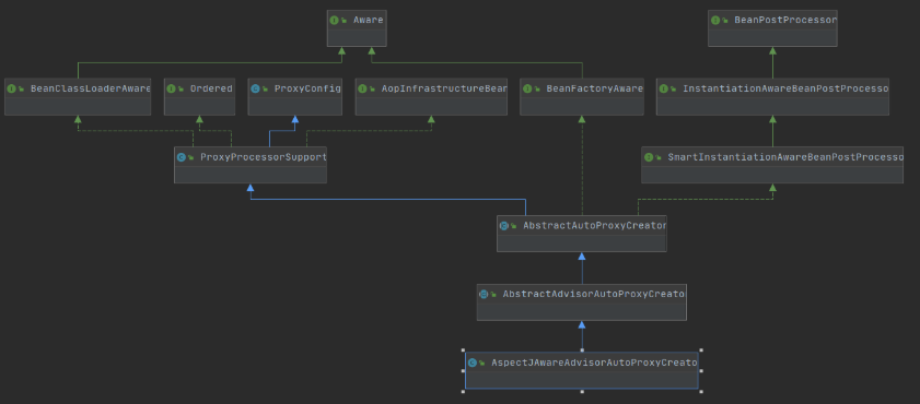 可以看到 AnnotationAwareAspectJAutoProxyCreator 是 AspectJAwareAdvisorAutoProxyCreator 的子类, AspectJAwareAdvisorAutoProxyCreator 是解析 <aop:config/> 的时候使用的。