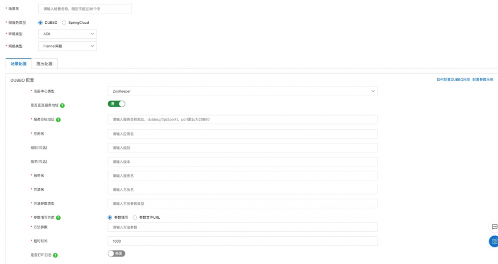 4.在场景配置页签下,填写Dubbo服务配置信息,具体参数填写参考文档: https://help.aliyun.com/document_detail/165220.html 。