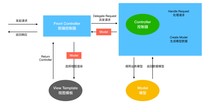 主要了解请求处理的流程,在 DispatcherServlet 中,先通过请求从handlerMappings 中获取对应的handler ,然后通过handler 找到对应的 handlerAdapter 然后通过handlerAdapter 的handle() 方法真正执行我么controller 层的业务逻辑。并返回一个 ModeAndView 然后通过 ViewResolver 解析成view 并渲染到界面上。